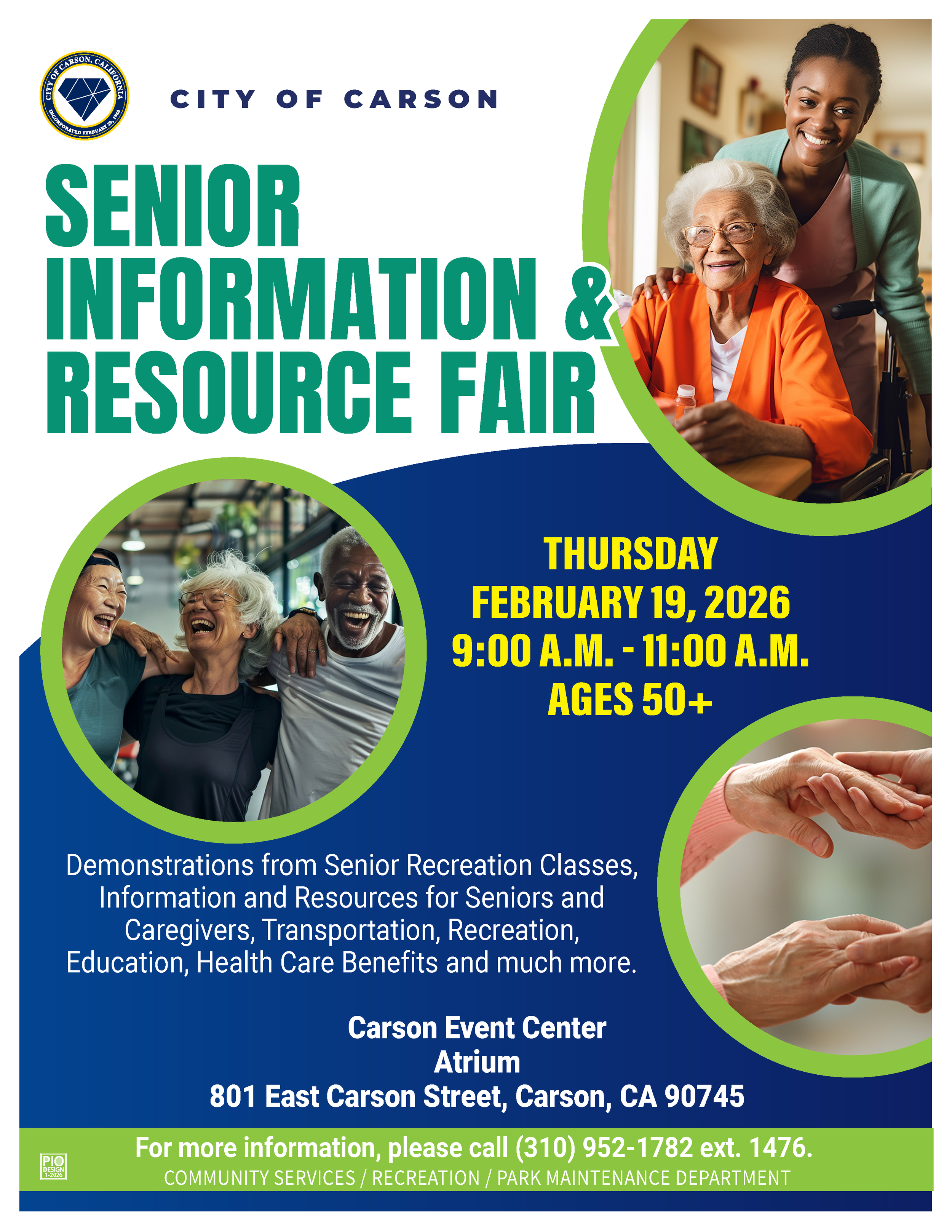 Join us for the Senior Information & Resource Fair on February 19, 2026, at the Carson Event Center. Enjoy demonstrations from senior recreation classes, information and resources for seniors and caregivers, transportation, education, healthcare benefits, and much more! Gain valuable resources and connect with your community.